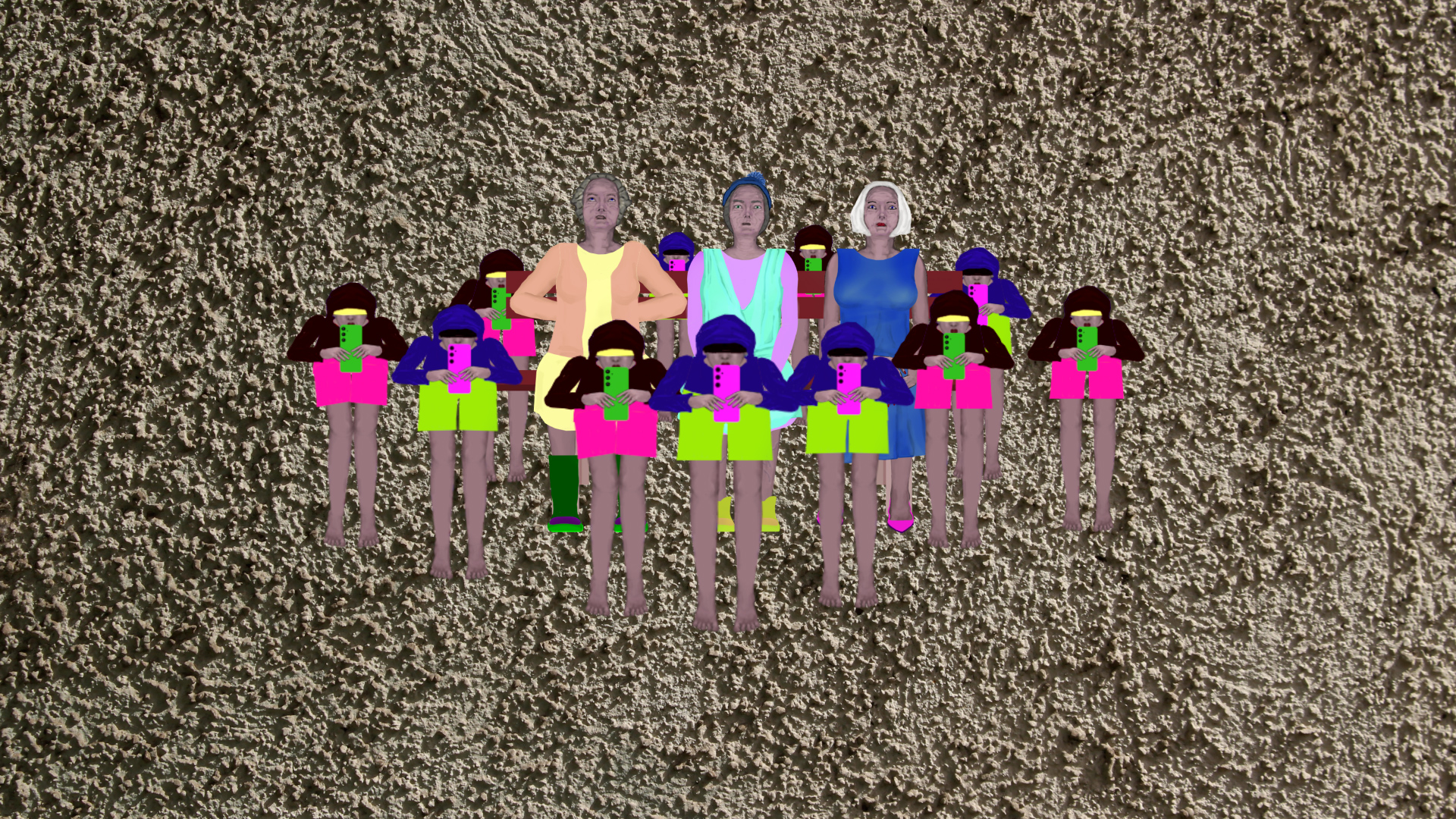 People meet in front of a wall, for whose selfies no danger is too great for them and no pose too embarrassing. Three elderly women silently watch the crazy goings-on from a park bench until they finally become part of the mobile phone madness themselves.
